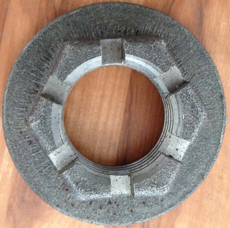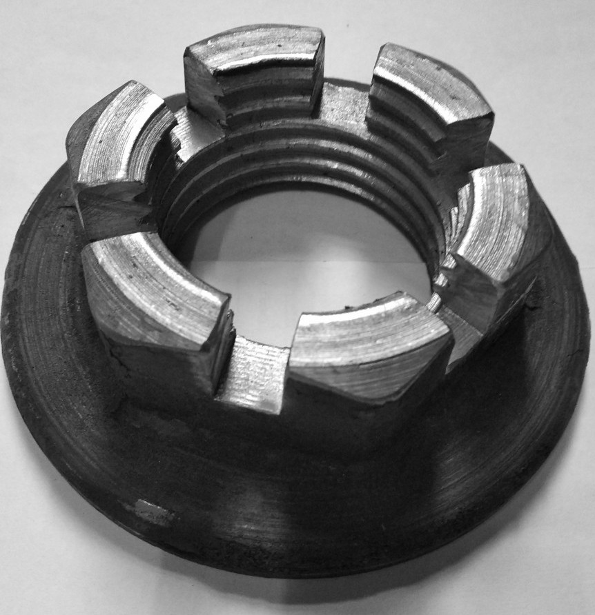 Гайка шпинтона 30.21.103 використовується для затягування втулки через тарілчасту пружину в вузлі буксового підвішування візків пасажирських, багажних та вагонів ресторанів.